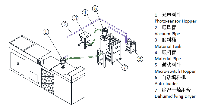 在轉(zhuǎn)輪除濕機(jī)內(nèi)部,蜂巢轉(zhuǎn)輪密封分為除濕、冷卻和再生三個(gè)區(qū)域。從干燥桶回來的濕熱空氣經(jīng)冷卻后吹入轉(zhuǎn)輪,空氣中的水分被轉(zhuǎn)輪吸附,然后轉(zhuǎn)輪轉(zhuǎn)動(dòng),吸附水 分的區(qū)域成為再生區(qū)域,所吸附的水分被加熱空氣所帶走。兩股空氣同時(shí)作用于轉(zhuǎn)輪上,隨著轉(zhuǎn)輪緩慢轉(zhuǎn)動(dòng),原料中的水份不斷的被帶至轉(zhuǎn)輪吸附又被再生空氣所脫 附并排出,從而形成穩(wěn)定的低露點(diǎn)空氣,加熱至干燥原料所需的溫度后被吹入干燥桶中,形成密閉循環(huán),對(duì)原料進(jìn)行除濕干燥作業(yè)。